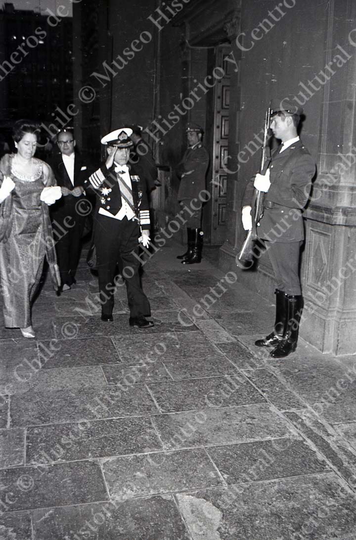 Comandante en Jefe de la Armada, Almirante Ramón Barros González, junto a su esposa, ingresando al Palacio de la Moneda para la cena de gala ofrecida por el Presidente Eduardo Frei Montalva a la Reina Isabel II del Reino Unido en el marco de su visita oficial.