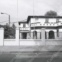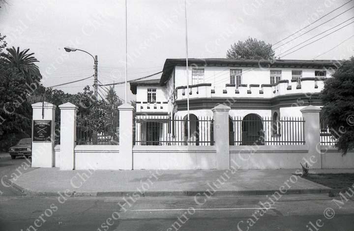 Guardia de la Escuela de Carabineros por Avenida Antonio Varas. En el costado izquierdo va saliendo un automóvil y se aprecia la antigua placa del plantel.