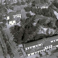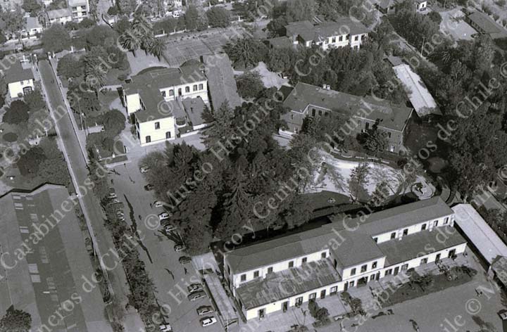 Vista áerea del sector norponiente de la Escuela de Carabineros de Chile del General Carlos Ibáñez del Campo. En la imagen se aprecia en la parte superior la Dirección - actual Museo Histórico Carabineros de Chile -, más abajo la Subdirección Administrativa y la piscina de Oficiales, al costado izquierdo el Casino de Oficiales y en el extremo inferior el Grupo de Aspirantes a Oficiales.