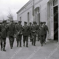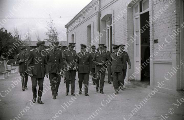 Fotografía grupal de la delegación en visita de la Policía Militar de Paraná, Brasil, a la Escuela de Carabineros del General Carlos Ibáñez del Campo, caminando por un sector del establecimiento, acompañados por el Director de la Escuela, Coronel Aliro Muñoz de la Fuente (al centro).