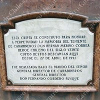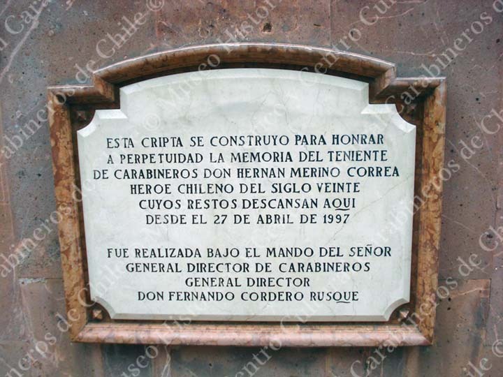 Placa de mármol que se encontraba en la cripta del Monumento a los Mártires de Carabineros "Gloria y Victoria", donde descansaban los restos del Teniente Hernán Merino Correa.