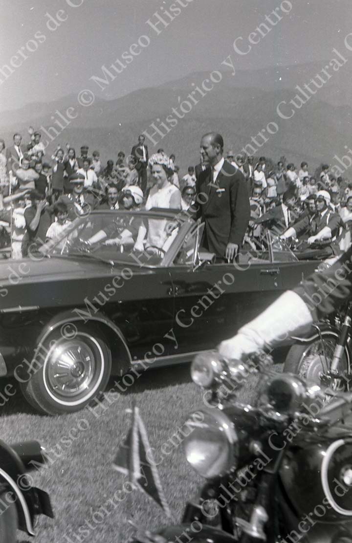 La Reina Isabel II del Reino Unido, junto a su esposo el Príncipe Felipe de Edimburgo, llegan al Club La Dehesa para asistir a la presentación del Cuadro Verde de Carabineros de Chile a bordo de un automóvil Ford Galaxie 500 XL descapotable, escoltado por personal motorizado de la policía uniformada.